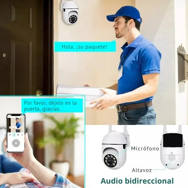 Gracias al micrófono receptivo incorporado en la cámara de seguridad para exteriores, puede escuchar y hablar a través de nuestra aplicación. El audio bidireccional le permite comunicarse con sus invitados, mientras que las alarmas de detección de movimiento le ayudarán a deshacerse rápidamente de los visitantes o animales no deseados.