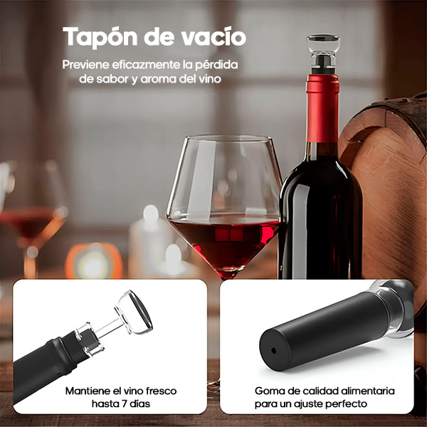 Solo coloca, presiona y sirve. El abridor retira el corcho en segundos, el aireador mejora el vertido y el tapón de vacío mantiene el vino fresco por más tiempo. ¡Sin esfuerzo ni desorden!