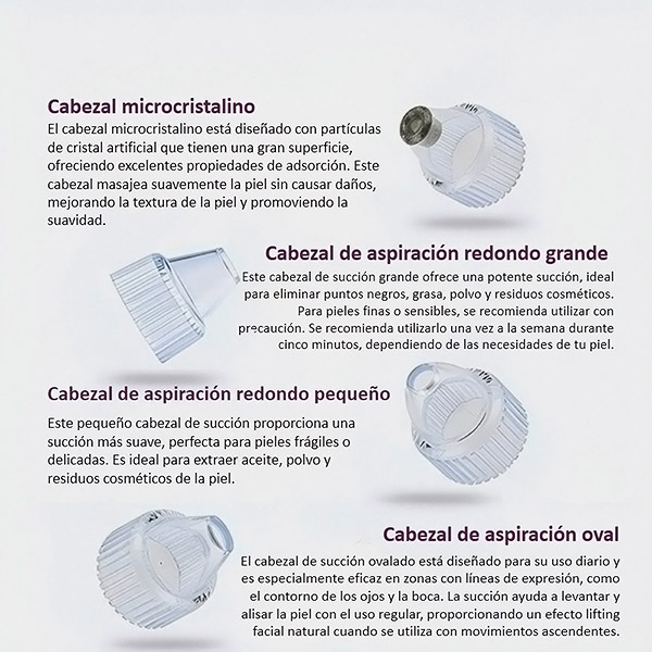 El dispositivo viene con 4 accesorios intercambiables, cada uno diseñado para tratar problemas específicos de la piel. Consulta el siguiente gráfico para obtener más información sobre el funcionamiento de cada accesorio.