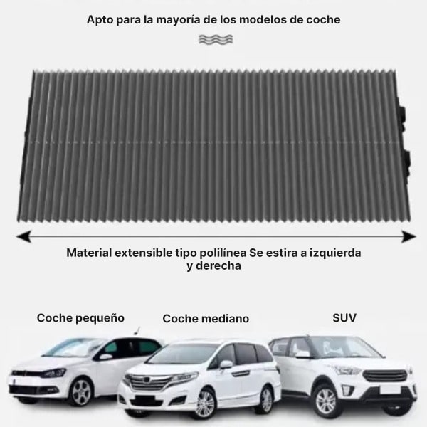Este parasol está diseñado para adaptarse a una amplia variedad de vehículos, incluidos autos, camionetas, camiones y SUV. Su diseño universal permite recortar el ancho a la medida deseada.