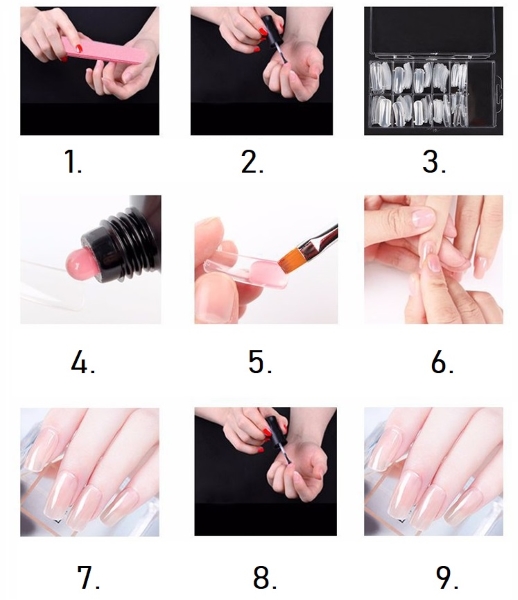 Aplica una capa delgada de poly gel bajo la uña artificial y luego la pegarás a tu uña natural. Después de secarlo en la lámpara LED, simplemente quita la una artificial.