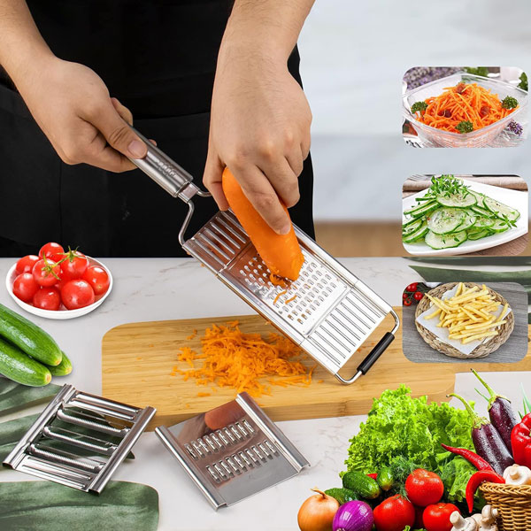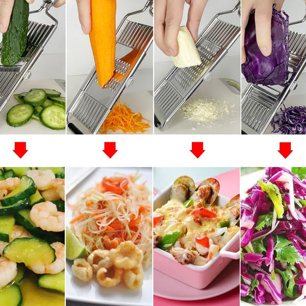 🧑🍳 Diseño multifuncional: Rebana, ralla y pica con una sola herramienta, perfecta para ensaladas, papas fritas y comidas rápidas.
